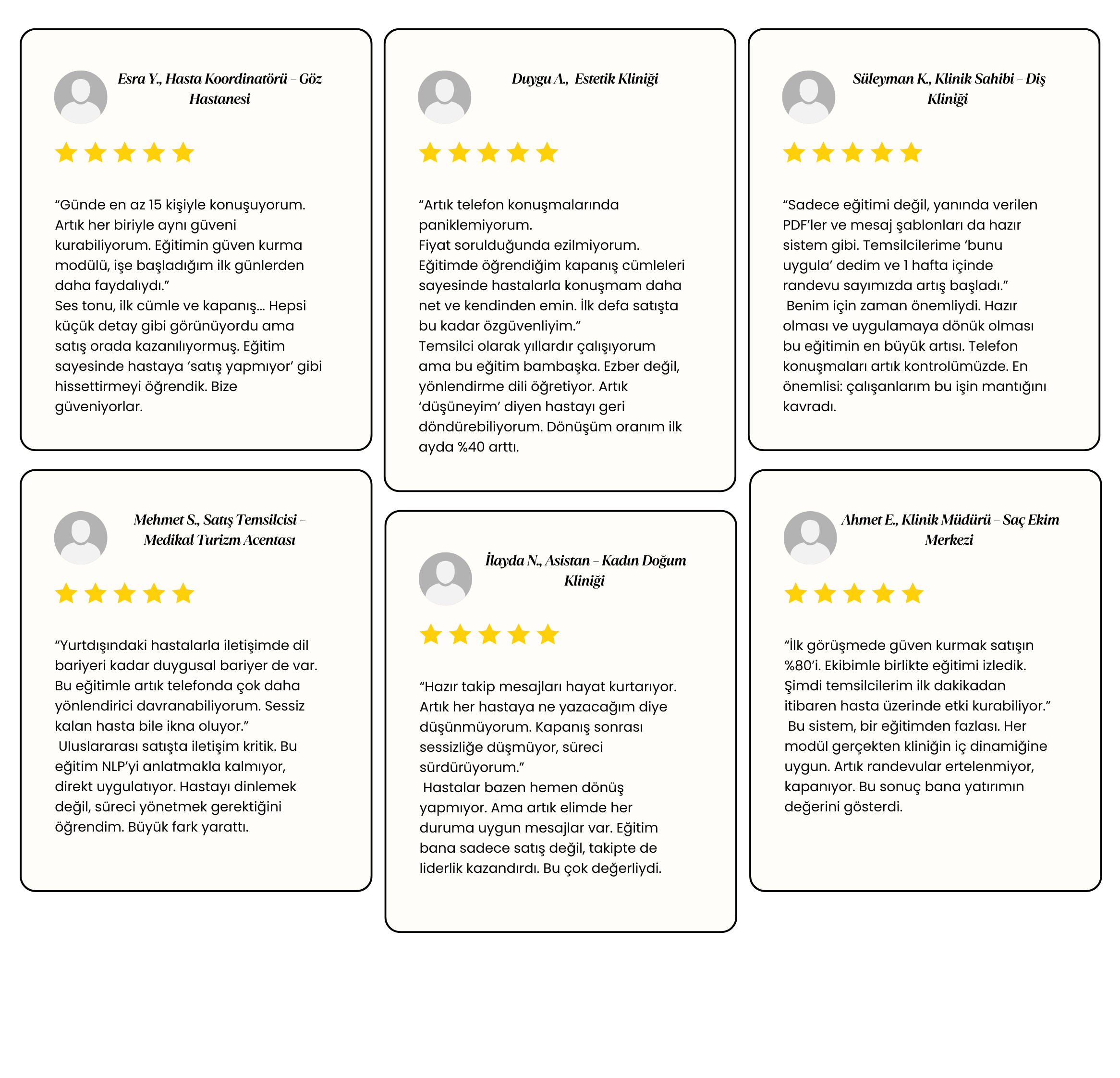 İster yerel hasta çalışıyor olun, ister yurt dışı hasta hedefleyin, bu sistem her hasta tipi için işe yarar. Çünkü odak noktası: telefon iletişiminde insan psikolojisini çözmek.